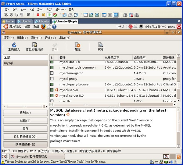 為了開發MYSQL應用程式,您必須安裝伺服器和開發函式庫。一般,您可以從套件管理元看到MySQL的選項;您只要確定開發函式庫也被安裝。下圖為安裝MySQL的情況,您還可以選擇一些額外的開發套件。