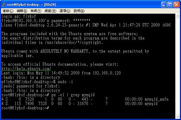 如果有看到一個或多個mysqld的處理程序,就代表MySQL伺服器已經啟動。其中mysqld_safe他是用來啟動真正的mysqld處理程序,使用正確的使用者。